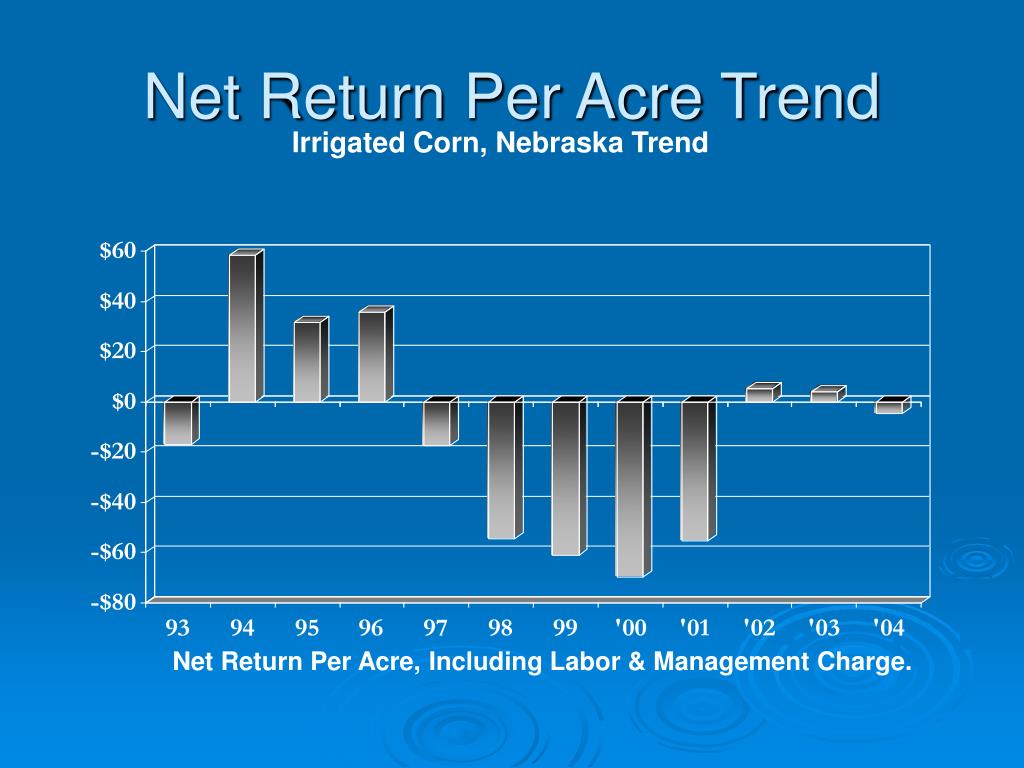 Net Return Per Acre Trend Irrigated Corn, Nebraska Trend Net Return Per Acre, Including Labor & Management Charge.