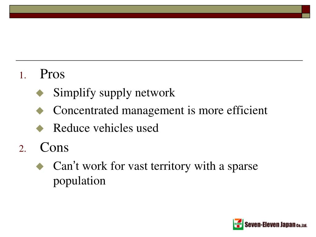 Pros • Simplify supply network • Concentrated management is more efficient • Reduce vehicles used • Cons • Can’t work for vast territory with a sparse population