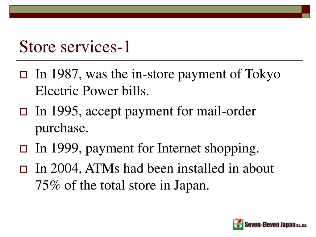 Store services-1 • In 1987, was the in-store payment of Tokyo Electric Power bills. • In 1995, accept payment for mail-order purchase. • In 1999, payment for Internet shopping. • In 2004, ATMs had been installed in about 75% of the total store in Japan.