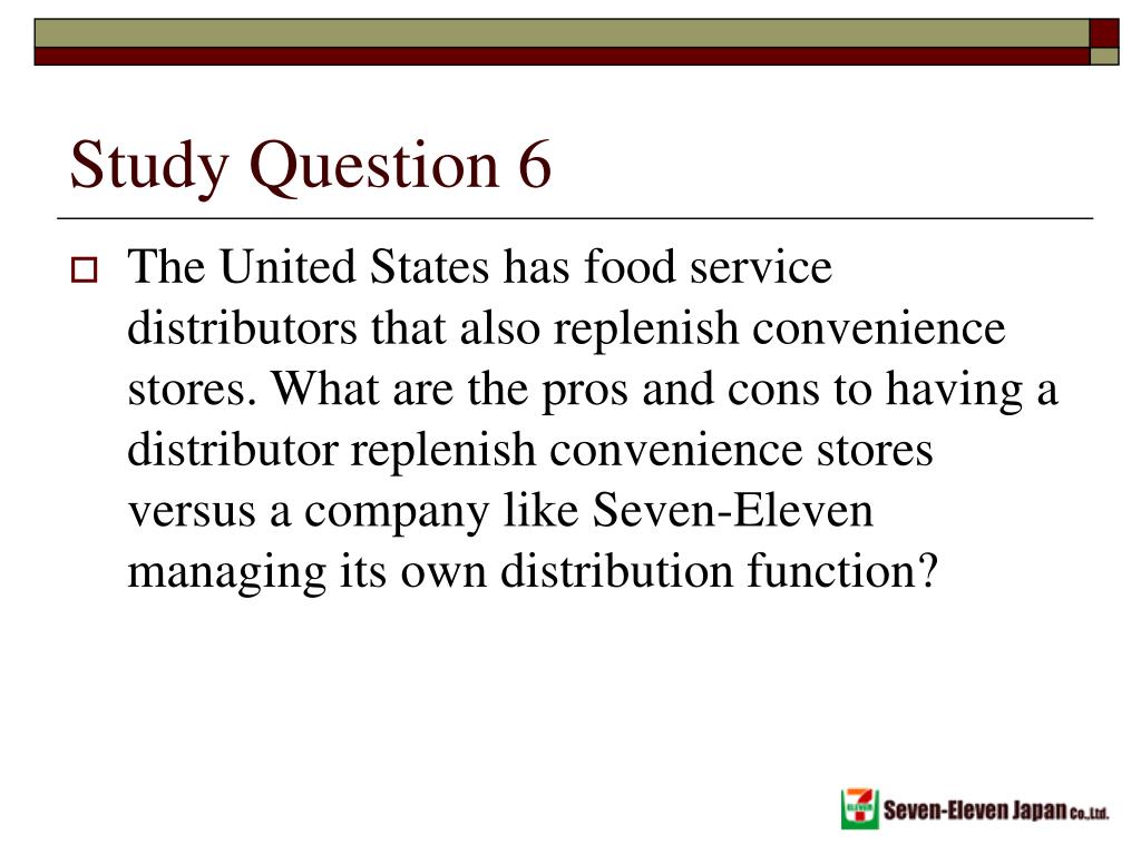 Study Question 6 • The United States has food service distributors that also replenish convenience stores. What are the pros and cons to having a distributor replenish convenience stores versus a company like Seven-Eleven managing its own distribution function?