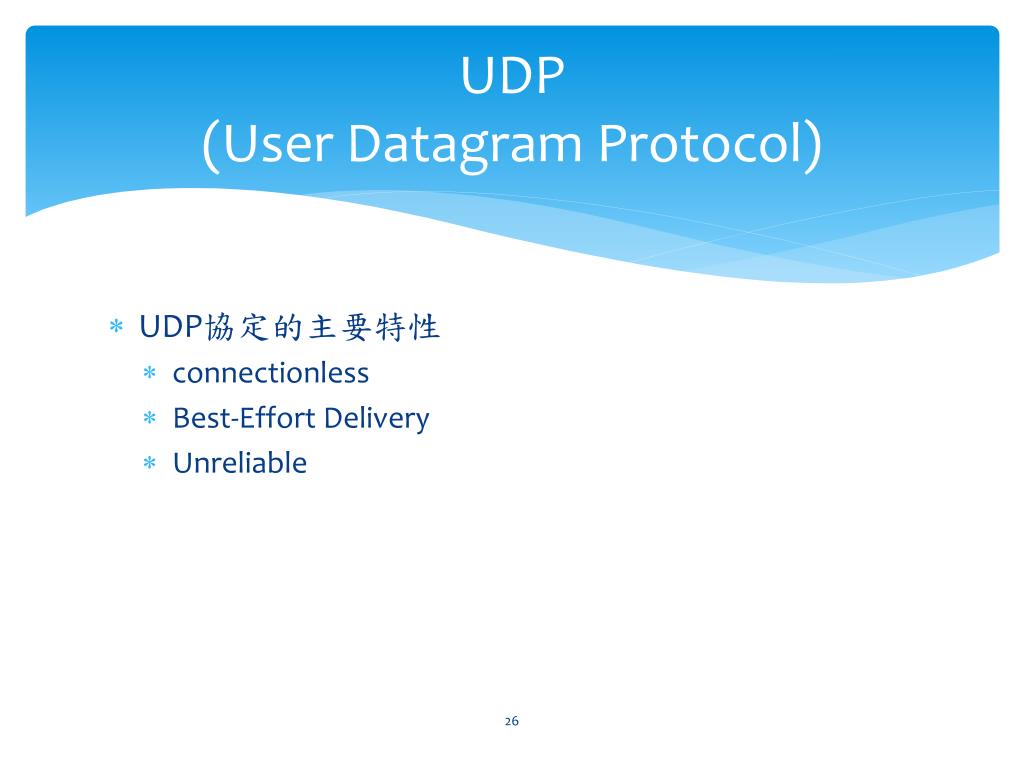 UDP(User Datagram Protocol) • UDP協定的主要特性 • connectionless • Best-Effort Delivery • Unreliable