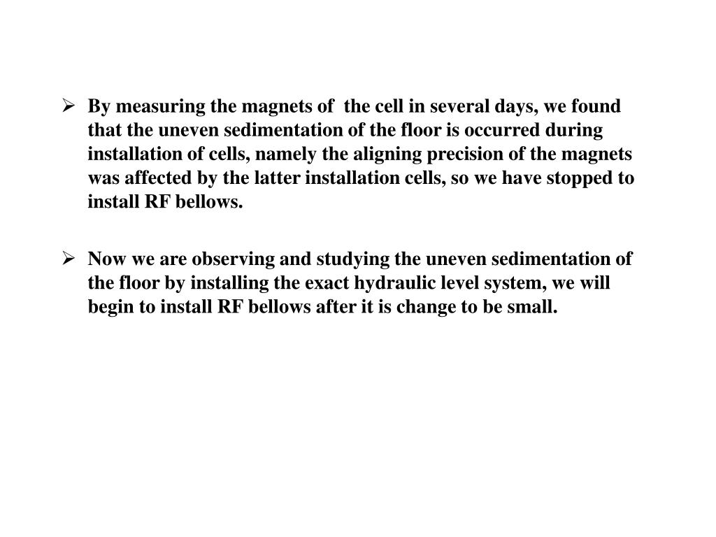 By measuring the magnets of the cell in several days, we found that the uneven sedimentation of the floor is occurred during installation of cells, namely the aligning precision of the magnets was affected by the latter installation cells, so we have stopped to install RF bellows. • Now we are observing and studying the uneven sedimentation of the floor by installing the exact hydraulic level system, we will begin to install RF bellows after it is change to be small.