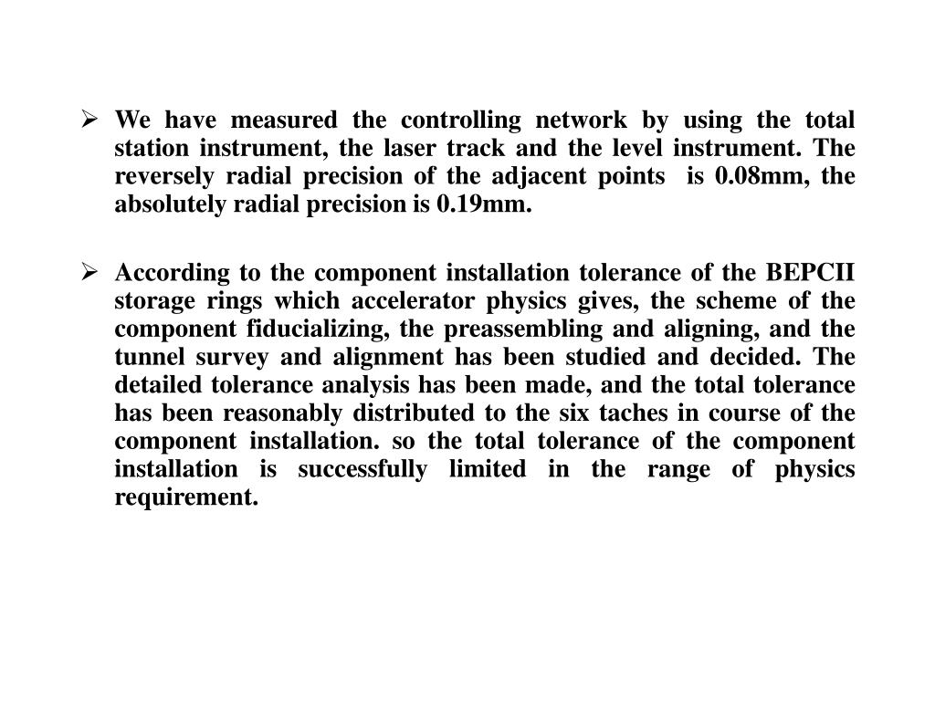 We have measured the controlling network by using the total station instrument, the laser track and the level instrument. The reversely radial precision of the adjacent points is 0.08mm, the absolutely radial precision is 0.19mm. • According to the component installation tolerance of the BEPCII storage rings which accelerator physics gives, the scheme of the component fiducializing, the preassembling and aligning, and the tunnel survey and alignment has been studied and decided. The detailed tolerance analysis has been made, and the total tolerance has been reasonably distributed to the six taches in course of the component installation. so the total tolerance of the component installation is successfully limited in the range of physics requirement.