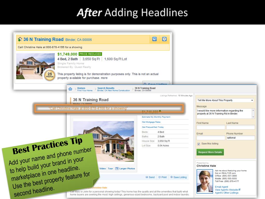 After Adding Headlines Best Practices Tip Add your name and phone number to help build your brand in your marketplace in one headline. Use the best property feature for second headline.