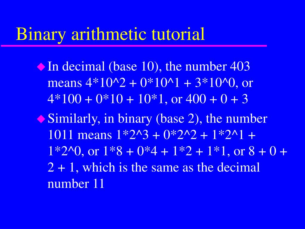 Binary arithmetic tutorial • In decimal (base 10), the number 403 means 4*10^2 + 0*10^1 + 3*10^0, or 4*100 + 0*10 + 10*1, or 400 + 0 + 3 • Similarly, in binary (base 2), the number 1011 means 1*2^3 + 0*2^2 + 1*2^1 + 1*2^0, or 1*8 + 0*4 + 1*2 + 1*1, or 8 + 0 + 2 + 1, which is the same as the decimal number 11