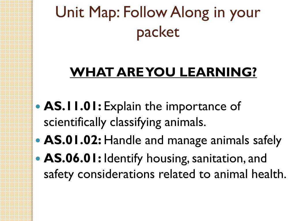 Unit Map: Follow Along in your packet WHAT ARE YOU LEARNING? AS.11.01: Explain the importance of scientifically classifying animals. AS.01.02: Handle and manage animals safely AS.06.01: Identify housing, sanitation, and safety considerations related to animal health.
