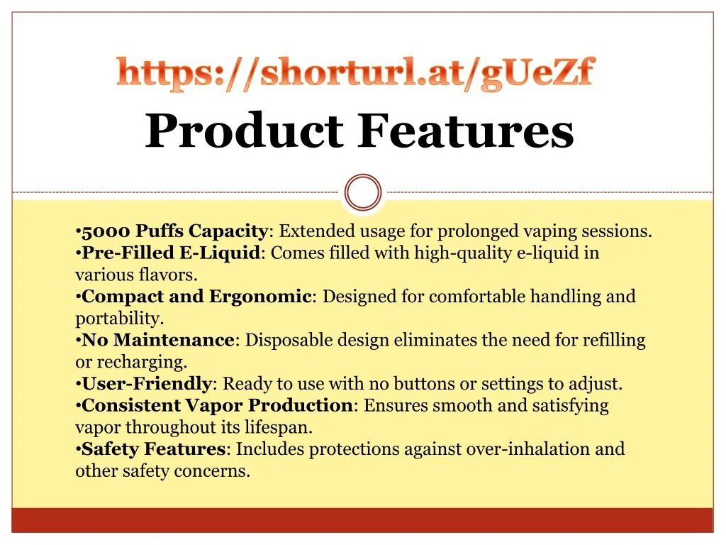 Product Features https://shorturl.at/gUeZf • 5000 Puffs Capacity: Extended usage for prolonged vaping sessions. • Pre-Filled E-Liquid: Comes filled with high-quality e-liquid in various flavors. • Compact and Ergonomic: Designed for comfortable handling and portability. • No Maintenance: Disposable design eliminates the need for refilling or recharging. • User-Friendly: Ready to use with no buttons or settings to adjust. • Consistent Vapor Production: Ensures smooth and satisfying vapor throughout its lifespan. • Safety Features: Includes protections against over-inhalation and other safety concerns.