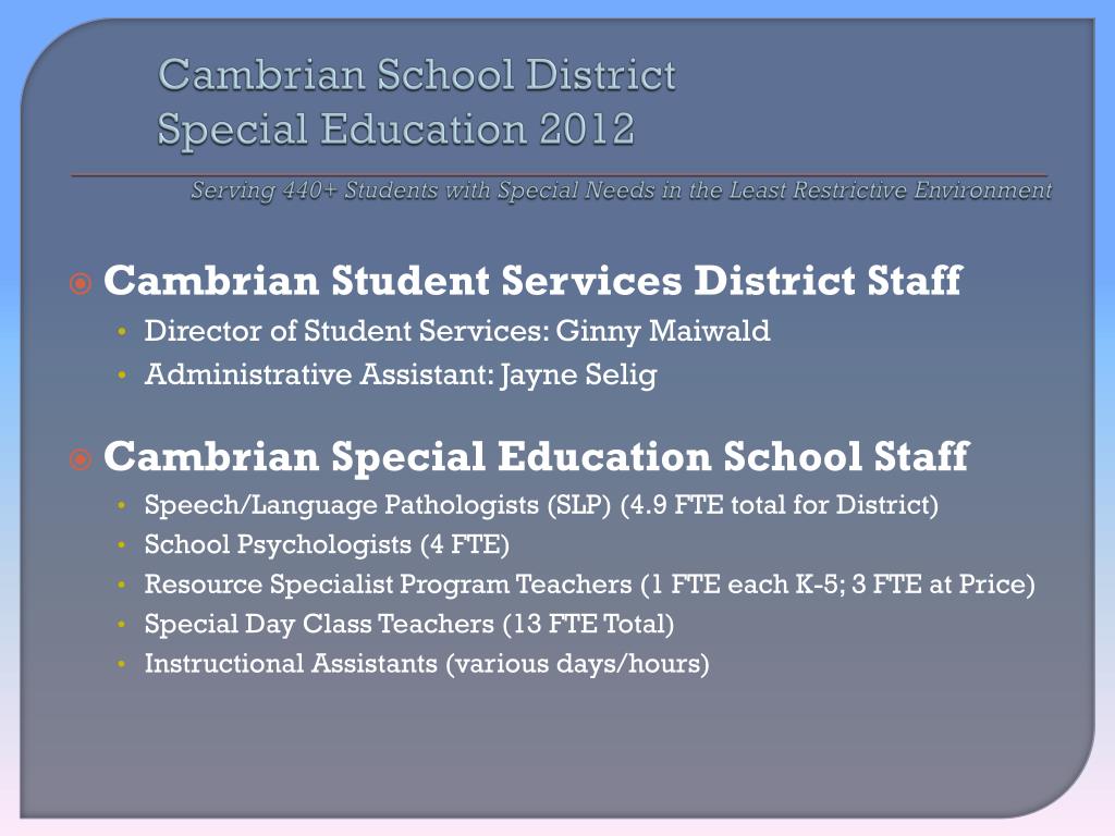 Cambrian School DistrictSpecial Education 2012Serving 440+ Students with Special Needs in the Least Restrictive Environment • Cambrian Student Services District Staff • Director of Student Services: Ginny Maiwald • Administrative Assistant: Jayne Selig • Cambrian Special Education School Staff • Speech/Language Pathologists (SLP) (4.9 FTE total for District) • School Psychologists (4 FTE) • Resource Specialist Program Teachers (1 FTE each K-5; 3 FTE at Price) • Special Day Class Teachers (13 FTE Total) • Instructional Assistants (various days/hours)