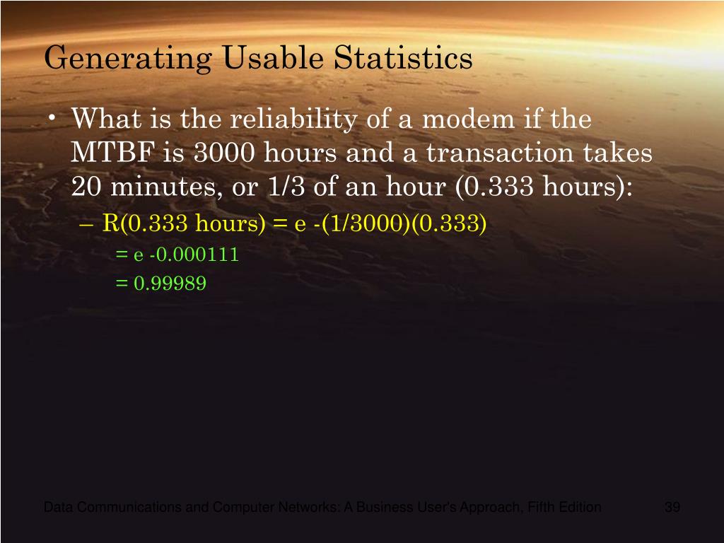 Generating Usable Statistics Reliability is defined by the equation: R(t) = e-bt In which: b = 1/MTBF t = the time interval of the operation Data Communications and Computer Networks: A Business User's Approach, Fifth Edition 38