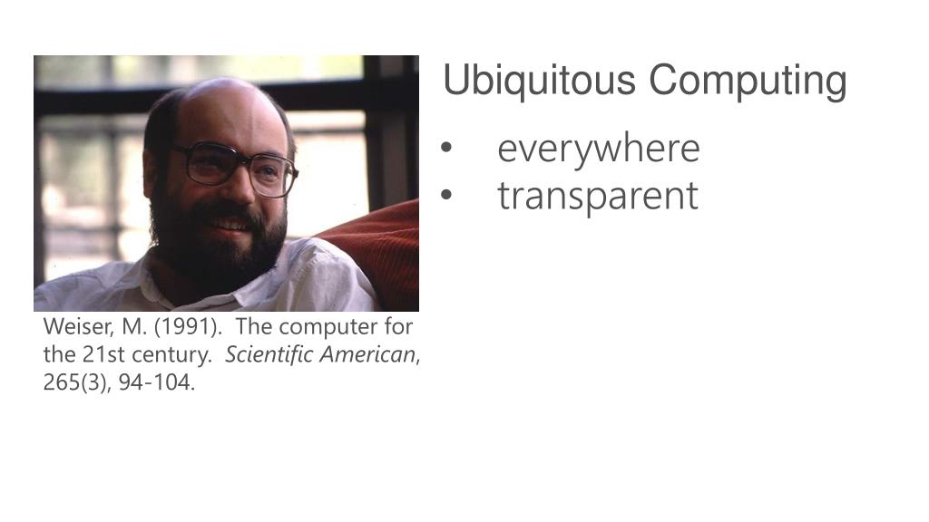 Ubiquitous Computing • everywhere • transparent Weiser, M. (1991). The computer for the 21st century. Scientific American, 265(3), 94-104.