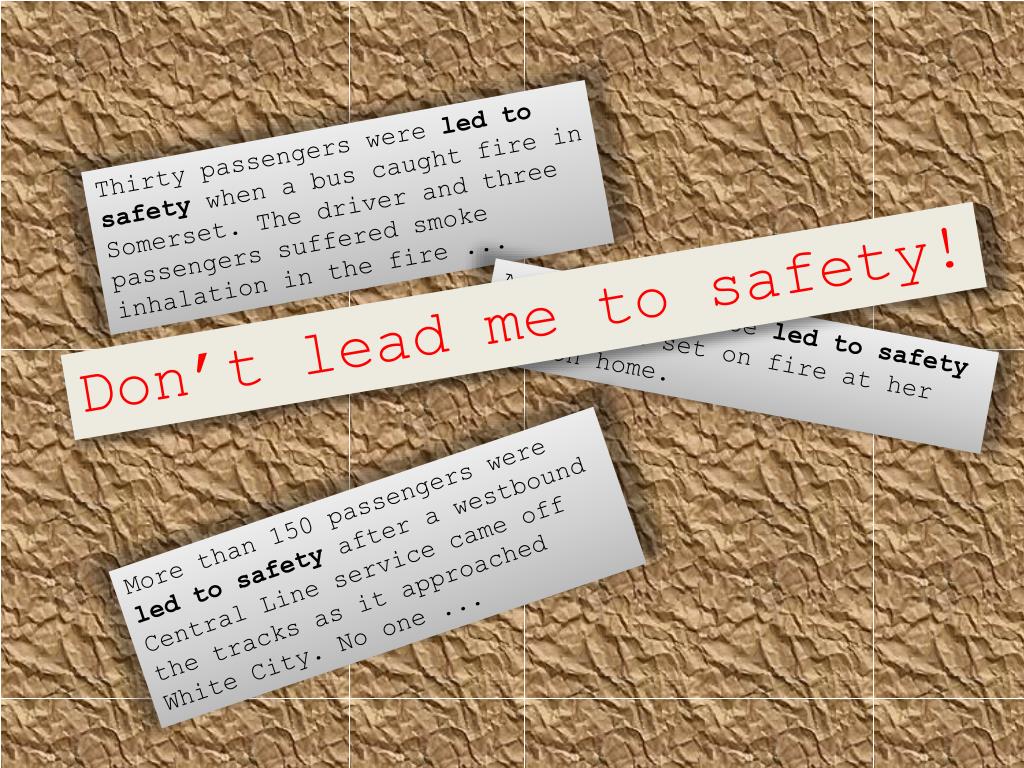 Thirty passengers were led to safety when a bus caught fire in Somerset. The driver and three passengers suffered smoke inhalation in the fire ... Don’t lead me to safety! A woman had to be led to safety when a pan set on fire at her Nelson home. More than 150 passengers were led to safety after a westbound Central Line service came off the tracks as it approached White City. No one ...