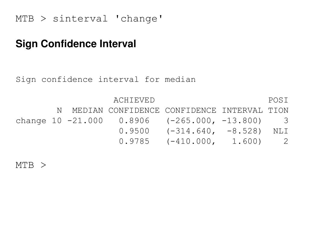 MTB > sinterval 'change' Sign Confidence Interval Sign confidence interval for median ACHIEVED POSI N MEDIAN CONFIDENCE CONFIDENCE INTERVAL TION change 10 -21.000 0.8906 (-265.000, -13.800) 3 0.9500 (-314.640, -8.528) NLI 0.9785 (-410.000, 1.600) 2 MTB >