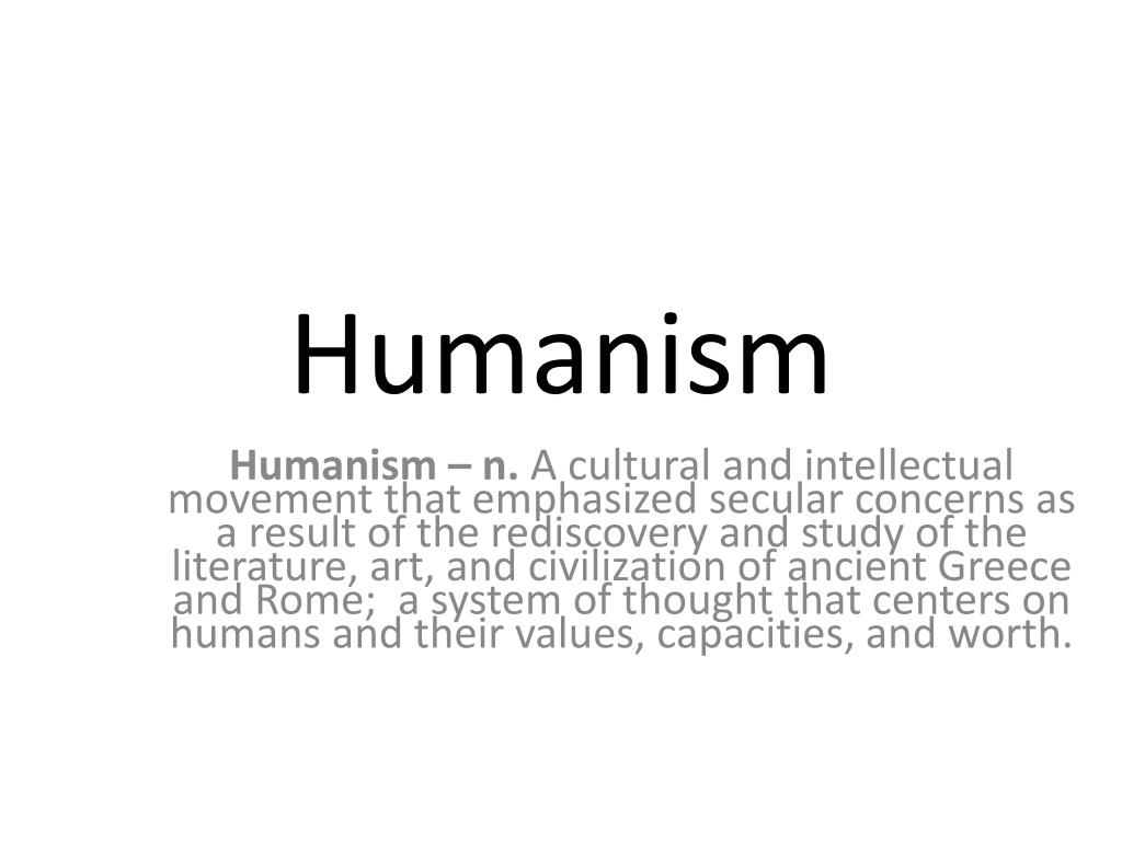 Humanism Humanism – n. A cultural and intellectual movement that emphasized secular concerns as a result of the rediscovery and study of the literature, art, and civilization of ancient Greece and Rome; a system of thought that centers on humans and their values, capacities, and worth.