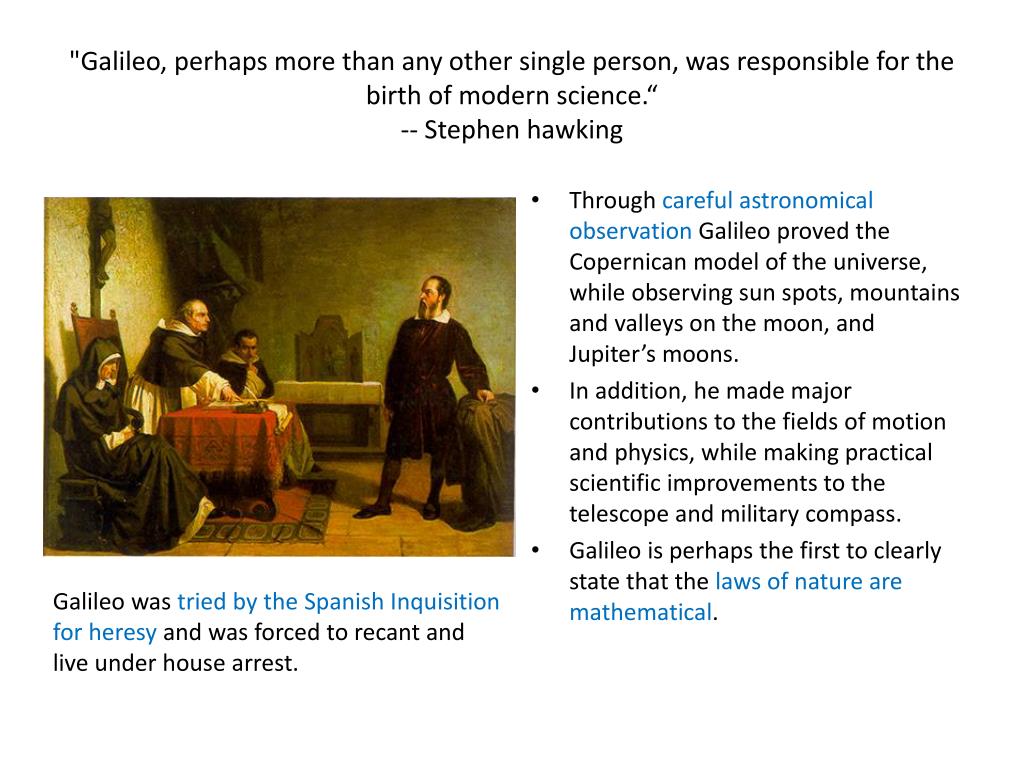 "Galileo, perhaps more than any other single person, was responsible for the birth of modern science.“-- Stephen hawking • Through careful astronomical observation Galileo proved the Copernican model of the universe, while observing sun spots, mountains and valleys on the moon, and Jupiter’s moons. • In addition, he made major contributions to the fields of motion and physics, while making practical scientific improvements to the telescope and military compass. • Galileo is perhaps the first to clearly state that the laws of nature are mathematical. Galileo was tried by the Spanish Inquisition for heresy and was forced to recant and live under house arrest.