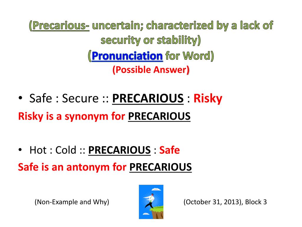 (Precarious-uncertain; characterized by a lack of security or stability)(Pronunciation for Word)(Possible Answer) • Safe : Secure ::PRECARIOUS: Risky Risky is a synonym for PRECARIOUS • Hot : Cold :: PRECARIOUS: Safe Safe is an antonym for PRECARIOUS (Non-Example and Why) (October 31, 2013), Block 3