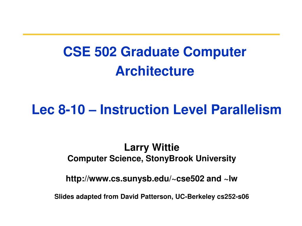 CSE 502 Graduate Computer Architecture Lec 8-10 – Instruction Level Parallelism. Larry Wittie Computer Science, StonyBrook University http://www.cs.sunysb.edu/~cse502 and ~lw Slides adapted from David Patterson, UC-Berkeley cs252-s06. Outline. ILP – Instruction Level Parallelism