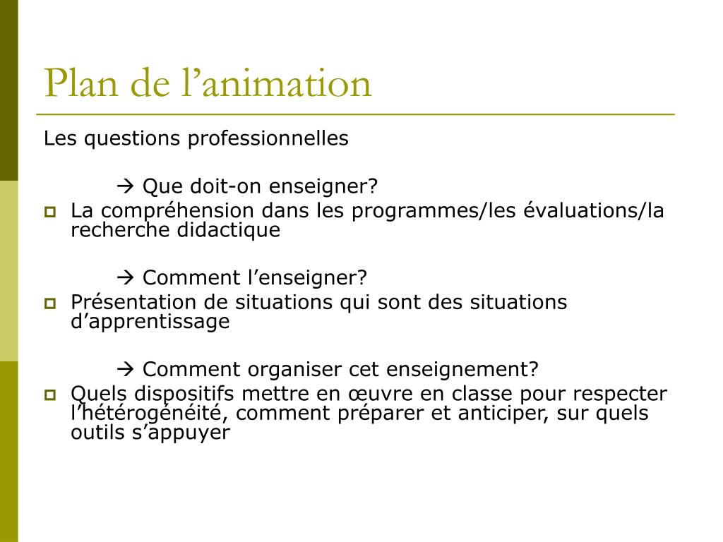 Plan de l’animation Les questions professionnelles Que doit-on enseigner? • La compréhension dans les programmes/les évaluations/la recherche didactique Comment l’enseigner? • Présentation de situations qui sont des situations d’apprentissage Comment organiser cet enseignement? • Quels dispositifs mettre en œuvre en classe pour respecter l’hétérogénéité, comment préparer et anticiper, sur quels outils s’appuyer
