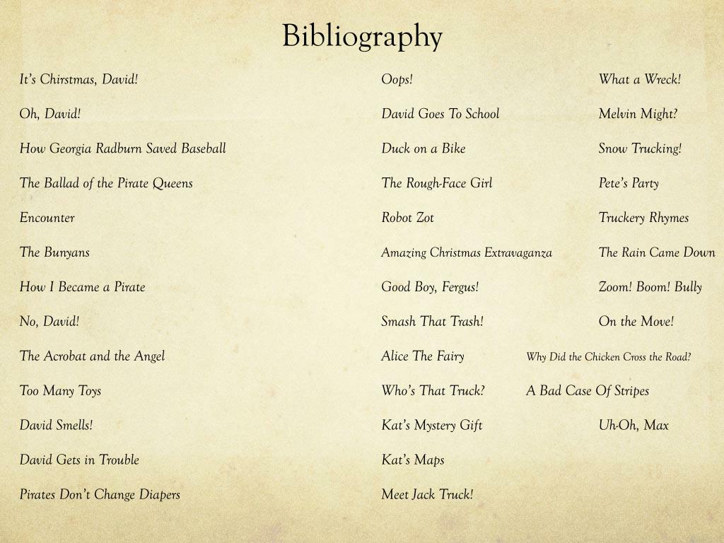 Bibliography It’s Chirstmas, David! Oops! What a Wreck! Oh, David! David Goes To School Melvin Might? How Georgia Radburn Saved Baseball Duck on a Bike Snow Trucking! The Ballad of the Pirate Queens The Rough-Face Girl Pete’s Party Encounter Robot ZotTruckery Rhymes The BunyansAmazing Christmas Extravaganza The Rain Came Down How I Became a Pirate Good Boy, Fergus! Zoom! Boom! Bully No, David! Smash That Trash! On the Move! The Acrobat and the Angel Alice The Fairy Why Did the Chicken Cross the Road? Too Many Toys Who’s That Truck? A Bad Case Of Stripes David Smells! Kat’s Mystery Gift Uh-Oh, Max David Gets in Trouble Kat’s Maps Pirates Don’t Change Diapers Meet Jack Truck!