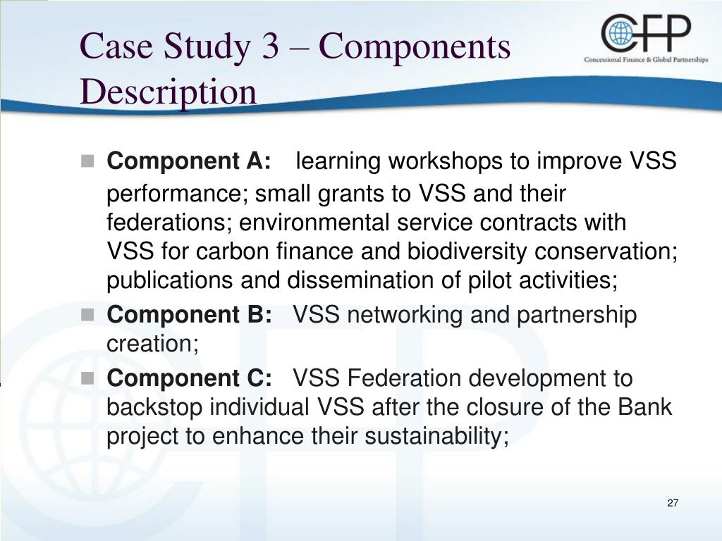 Case Study 3 – Components Description • Component A:learning workshops to improve VSS performance; small grants to VSS and their federations; environmental service contracts with VSS for carbon finance and biodiversity conservation; publications and dissemination of pilot activities; • Component B: VSS networking and partnership creation; • Component C:VSS Federation development to backstop individual VSS after the closure of the Bank project to enhance their sustainability;