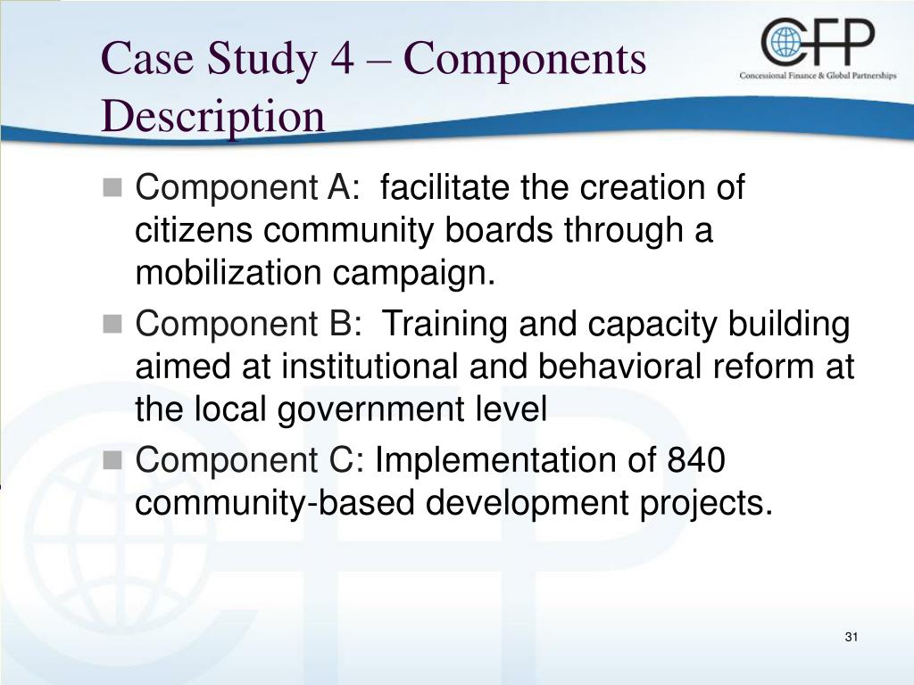 Case Study 4 – Components Description • Component A: facilitate the creation of citizens community boards through a mobilization campaign. • Component B: Training and capacity building aimed at institutional and behavioral reform at the local government level • Component C: Implementation of 840 community-based development projects.