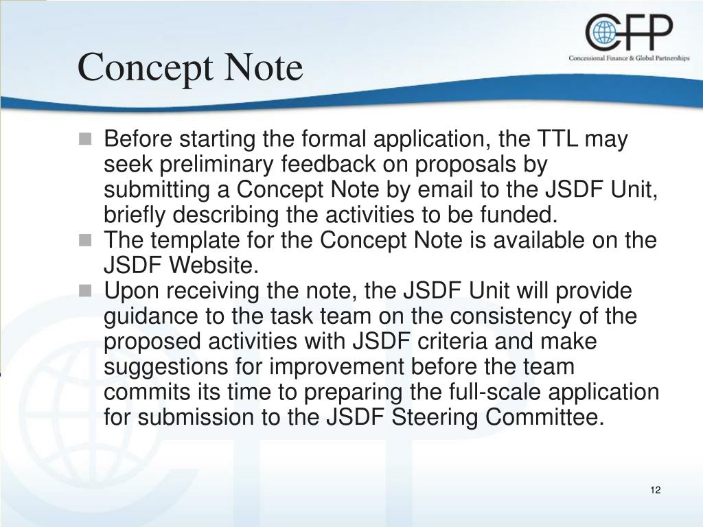 Concept Note • Before starting the formal application, the TTL may seek preliminary feedback on proposals by submitting a Concept Note by email to the JSDF Unit, briefly describing the activities to be funded. • The template for the Concept Note is available on the JSDF Website. • Upon receiving the note, the JSDF Unit will provide guidance to the task team on the consistency of the proposed activities with JSDF criteria and make suggestions for improvement before the team commits its time to preparing the full-scale application for submission to the JSDF Steering Committee.