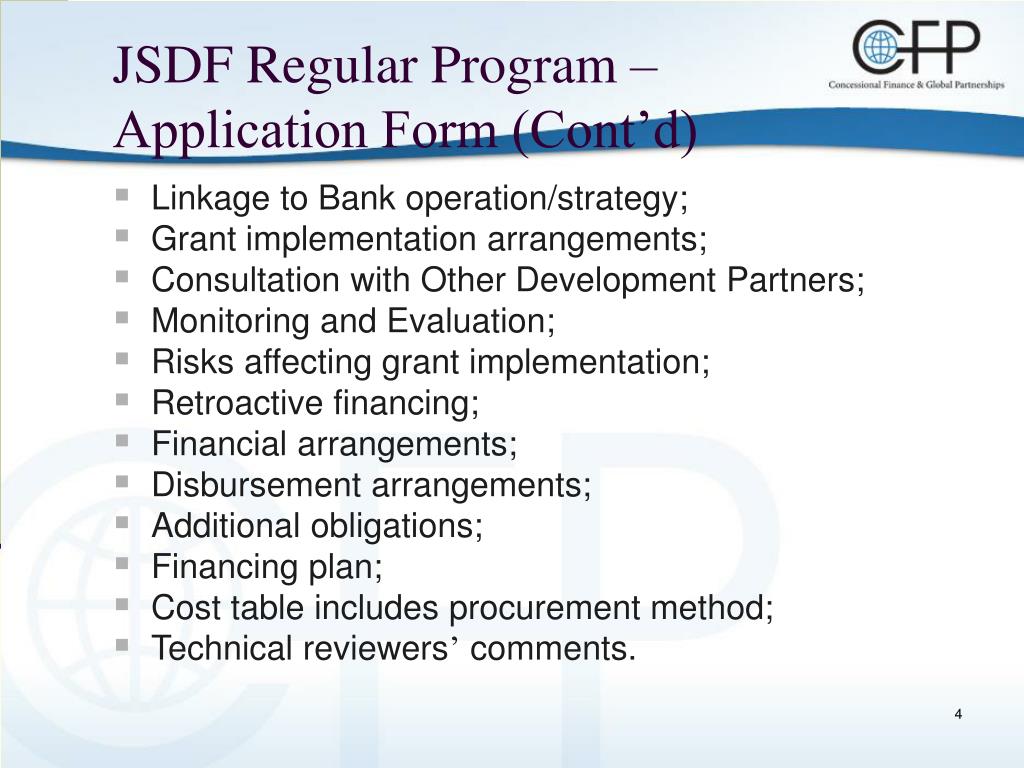 JSDF Regular Program – Application Form (Cont’d) • Linkage to Bank operation/strategy; • Grant implementation arrangements; • Consultation with Other Development Partners; • Monitoring and Evaluation; • Risks affecting grant implementation; • Retroactive financing; • Financial arrangements; • Disbursement arrangements; • Additional obligations; • Financing plan; • Cost table includes procurement method; • Technical reviewers’ comments.