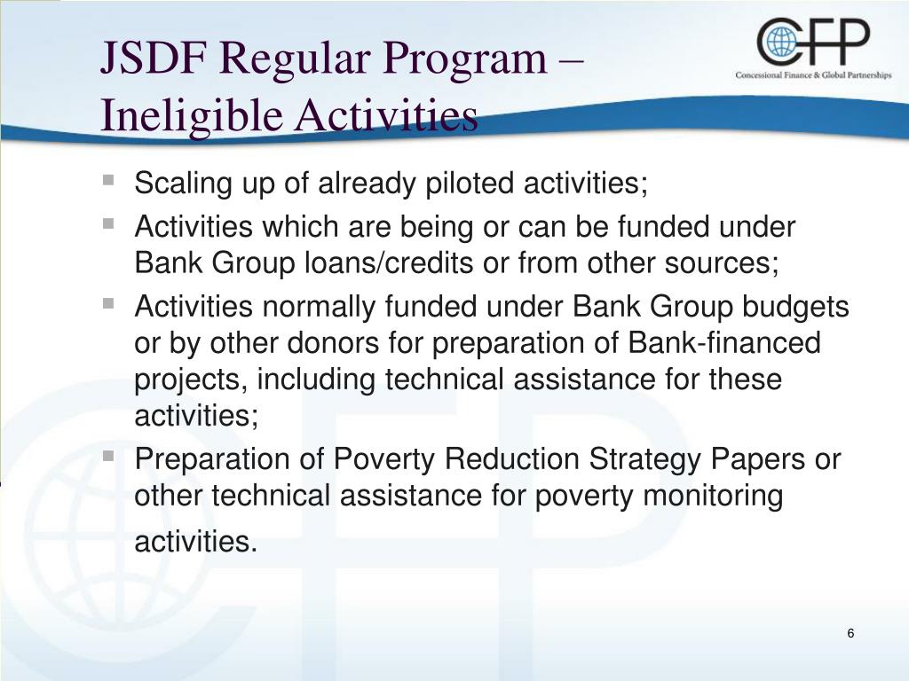 JSDF Regular Program – Ineligible Activities • Scaling up of already piloted activities; • Activities which are being or can be funded under Bank Group loans/credits or from other sources; • Activities normally funded under Bank Group budgets or by other donors for preparation of Bank-financed projects, including technical assistance for these activities; • Preparation of Poverty Reduction Strategy Papers or other technical assistance for poverty monitoring activities.