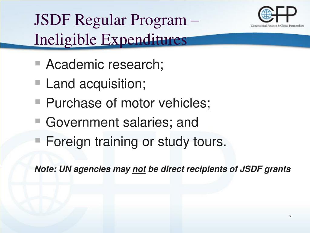 JSDF Regular Program – Ineligible Expenditures • Academic research; • Land acquisition; • Purchase of motor vehicles; • Government salaries; and • Foreign training or study tours. Note: UN agencies may not be direct recipients of JSDF grants