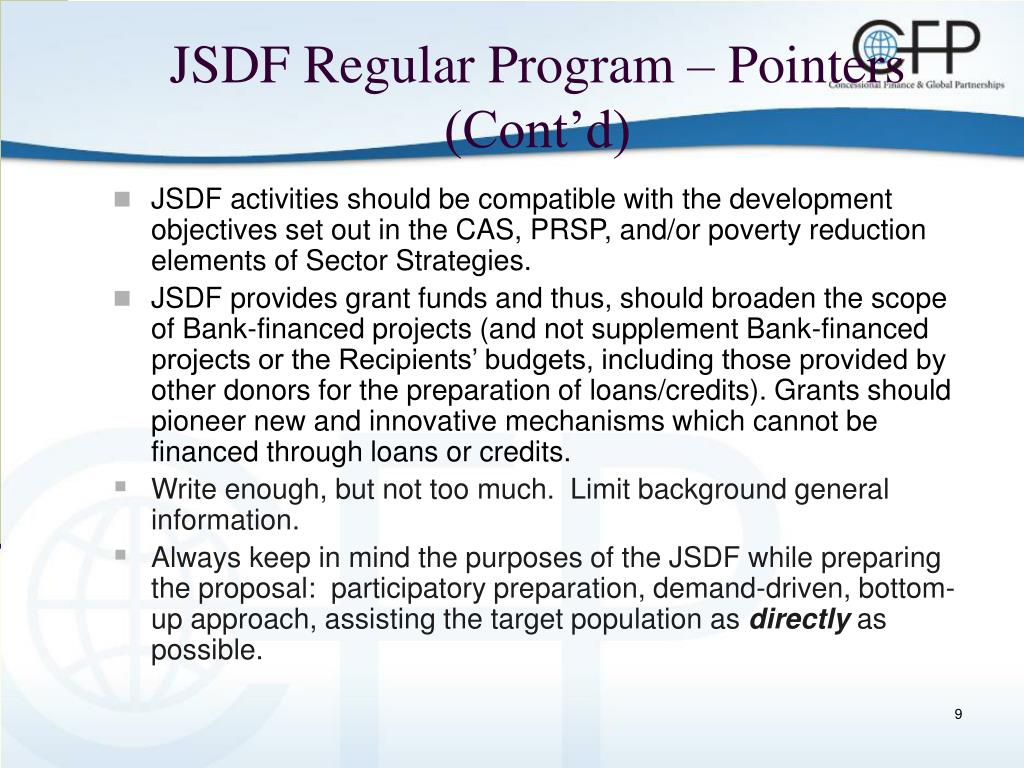 JSDF Regular Program – Pointers (Cont’d) • JSDF activities should be compatible with the development objectives set out in the CAS, PRSP, and/or poverty reduction elements of Sector Strategies. • JSDF provides grant funds and thus, should broaden the scope of Bank-financed projects (and not supplement Bank-financed projects or the Recipients’ budgets, including those provided by other donors for the preparation of loans/credits). Grants should pioneer new and innovative mechanisms which cannot be financed through loans or credits. • Write enough, but not too much. Limit background general information. • Always keep in mind the purposes of the JSDF while preparing the proposal: participatory preparation, demand-driven, bottom-up approach, assisting the target population as directly as possible.