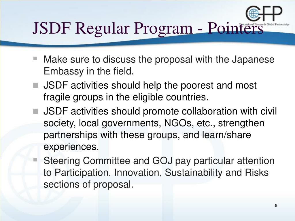 JSDF Regular Program - Pointers • Make sure to discuss the proposal with the Japanese Embassy in the field. • JSDF activities should help the poorest and most fragile groups in the eligible countries. • JSDF activities should promote collaboration with civil society, local governments, NGOs, etc., strengthen partnerships with these groups, and learn/share experiences. • Steering Committee and GOJ pay particular attention to Participation, Innovation, Sustainability and Risks sections of proposal.