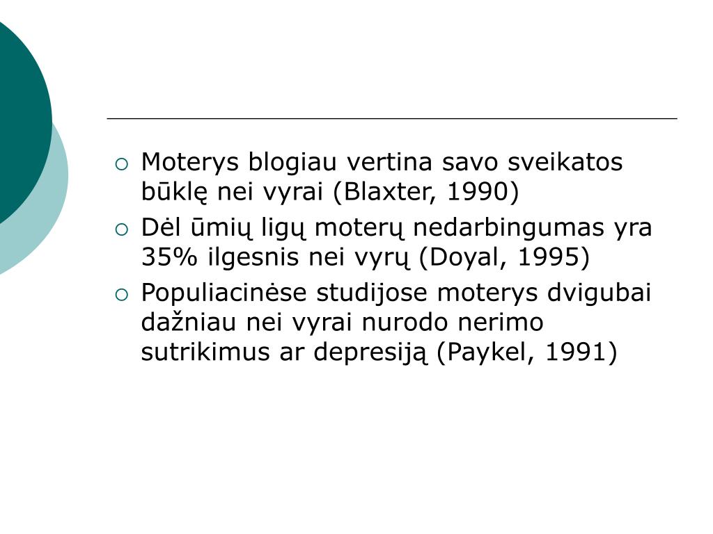Moterys blogiau vertina savo sveikatos būklę nei vyrai (Blaxter, 1990) • Dėl ūmių ligų moterų nedarbingumas yra 35% ilgesnis nei vyrų (Doyal, 1995) • Populiacinėse studijose moterys dvigubai dažniau nei vyrai nurodo nerimo sutrikimus ar depresiją (Paykel, 1991)