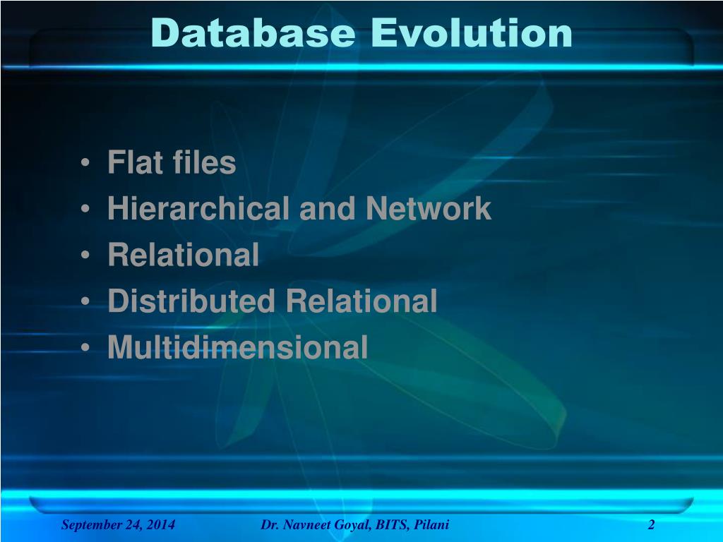 Database Evolution • Flat files • Hierarchical and Network • Relational • Distributed Relational • Multidimensional