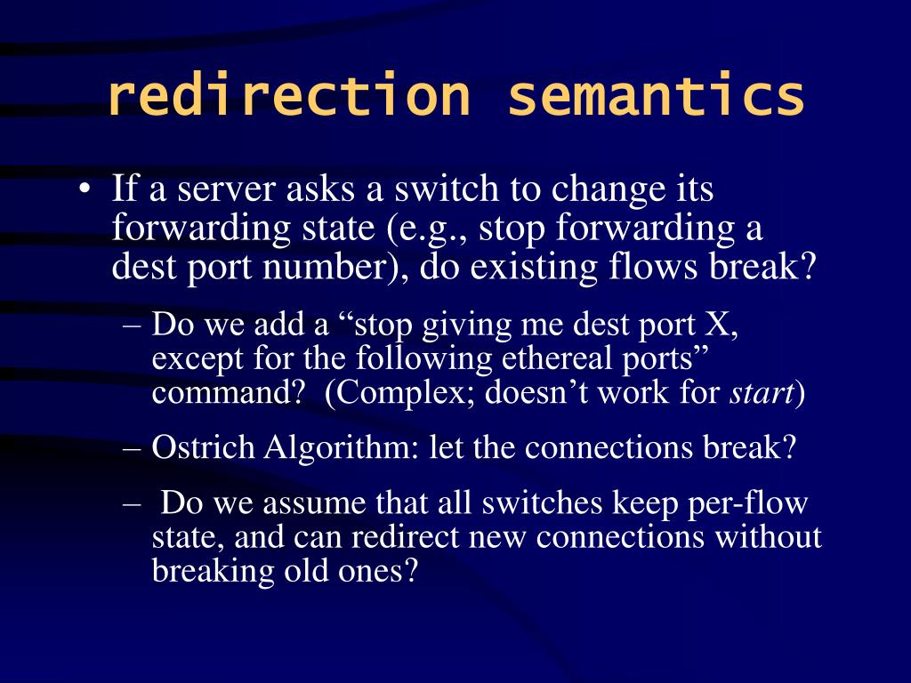 redirection semantics • If a server asks a switch to change its forwarding state (e.g., stop forwarding a dest port number), do existing flows break? • Do we add a “stop giving me dest port X, except for the following ethereal ports” command? (Complex; doesn’t work for start) • Ostrich Algorithm: let the connections break? • Do we assume that all switches keep per-flow state, and can redirect new connections without breaking old ones?