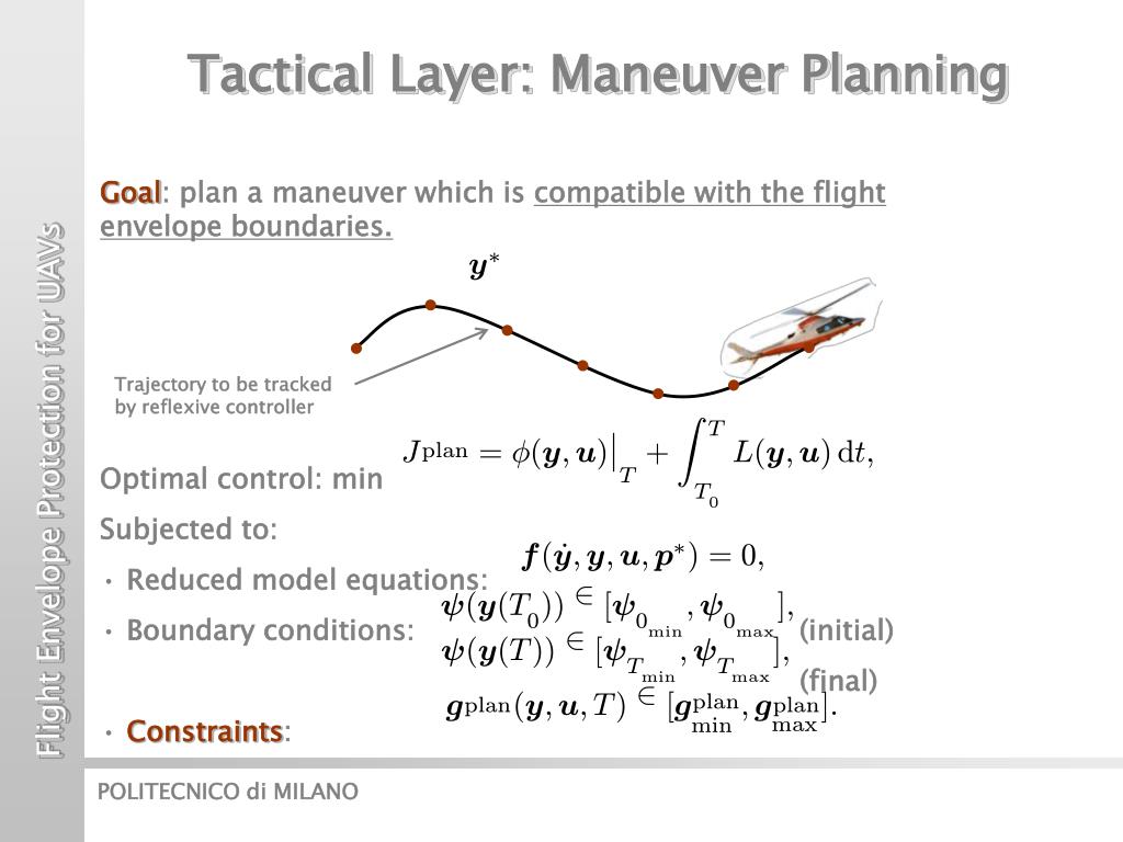 T l l l p a n Z ( ( ( ( ( ( ) ) ) ) [ [ ) ) [ ] ] ] à à f à à à à ¤ ¤ _ T T T p a n p a n 0 2 2 2 g y y y y y y u u p g g = T T l 0 0 0 ¯ i ( ) ( ) p a n ; ; ; ; ; ; ; ; ; ; ; : Á d i i J L m a x t m n + m m n n m m a a x x y u y u = ¯ ; ; ; T T 0 Tactical Layer: Maneuver Planning • Goal: plan a maneuver which is compatible with the flight envelope boundaries. • Optimal control: min • Subjected to: • Reduced model equations: • Boundary conditions: (initial) • (final) • Constraints: Trajectory to be tracked by reflexive controller
