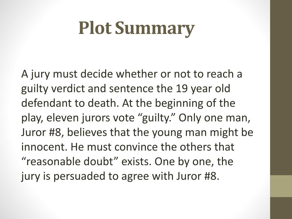 Plot Summary A jury must decide whether or not to reach a guilty verdict and sentence the 19 year old defendant to death. At the beginning of the play, eleven jurors vote “guilty.” Only one man, Juror #8, believes that the young man might be innocent. He must convince the others that “reasonable doubt” exists. One by one, the jury is persuaded to agree with Juror #8.