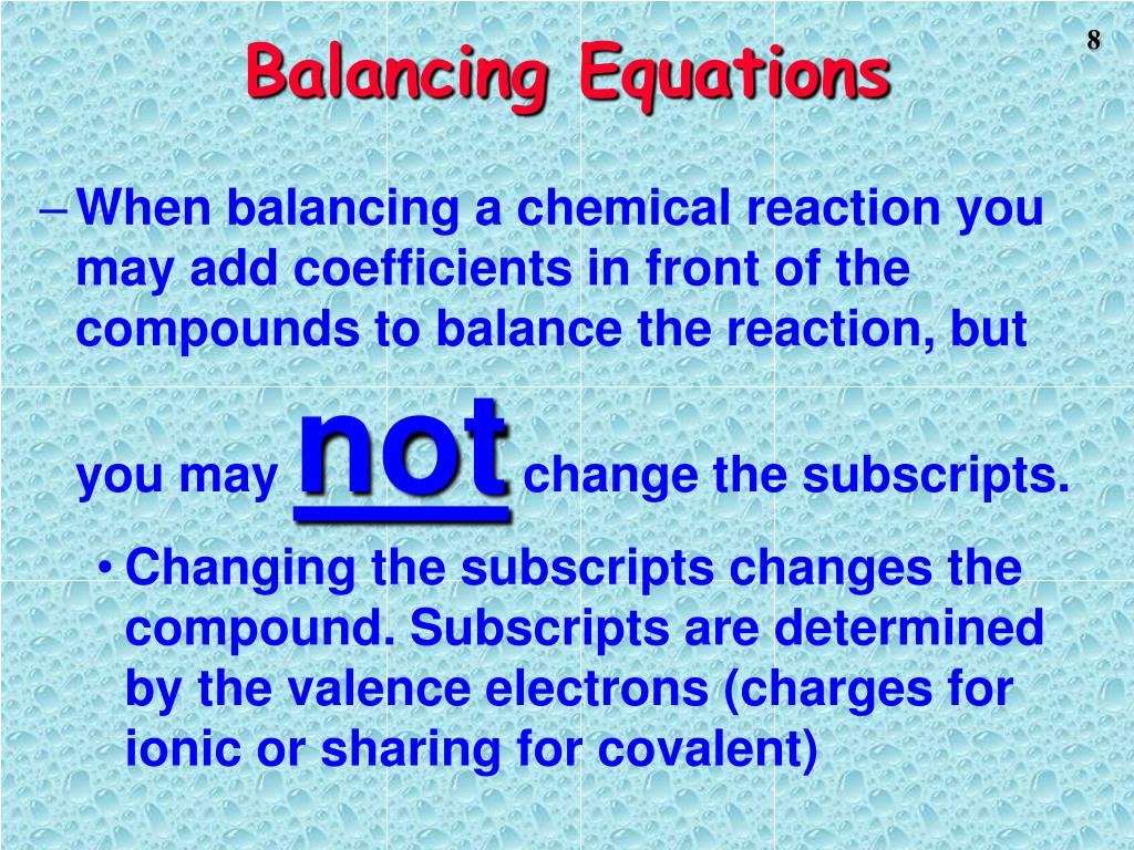 Balancing Equations • When balancing a chemical reaction you may add coefficients in front of the compounds to balance the reaction, but you may not change the subscripts. • Changing the subscripts changes the compound. Subscripts are determined by the valence electrons (charges for ionic or sharing for covalent)