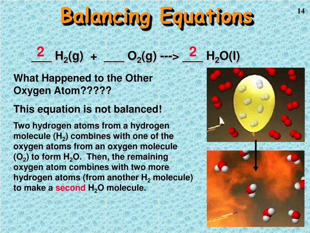 Balancing Equations 2 2 ___ H2(g) + ___ O2(g) ---> ___ H2O(l) What Happened to the Other Oxygen Atom????? This equation is not balanced! Two hydrogen atoms from a hydrogen molecule (H2) combines with one of the oxygen atoms from an oxygen molecule (O2) to form H2O. Then, the remaining oxygen atom combines with two more hydrogen atoms (from another H2 molecule) to make a second H2O molecule.