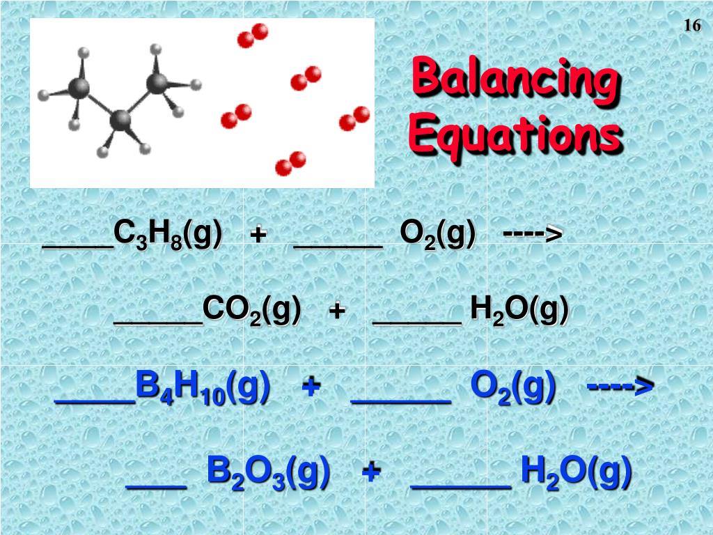 Balancing Equations ____C3H8(g) + _____ O2(g) ----> _____CO2(g) + _____ H2O(g) ____B4H10(g) + _____ O2(g) ----> ___ B2O3(g) + _____ H2O(g)
