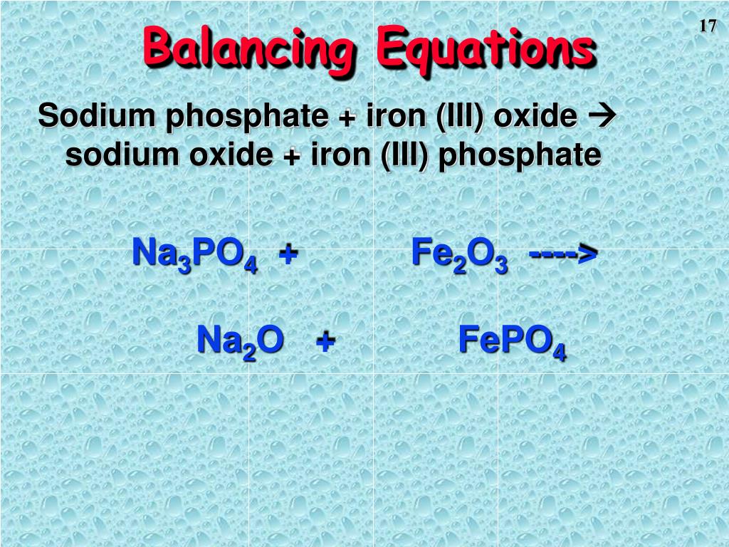 Balancing Equations Sodium phosphate + iron (III) oxide sodium oxide + iron (III) phosphate Na3PO4 + Fe2O3 ----> Na2O + FePO4