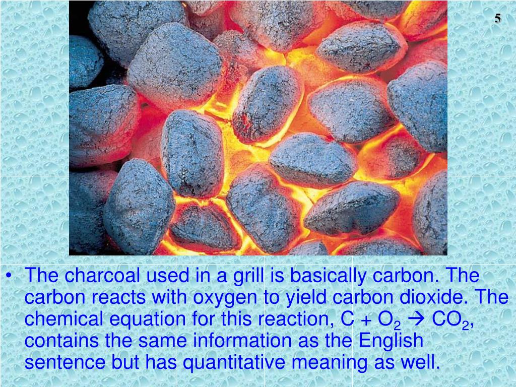 The charcoal used in a grill is basically carbon. The carbon reacts with oxygen to yield carbon dioxide. The chemical equation for this reaction, C + O2 CO2, contains the same information as the English sentence but has quantitative meaning as well.