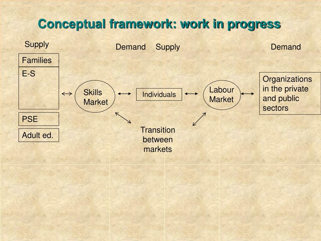 Conceptual framework: work in progress Supply Demand Supply Demand Families E-S Organizations in the private and public sectors Labour Market Skills Market Individuals PSE Transition between markets Adult ed.