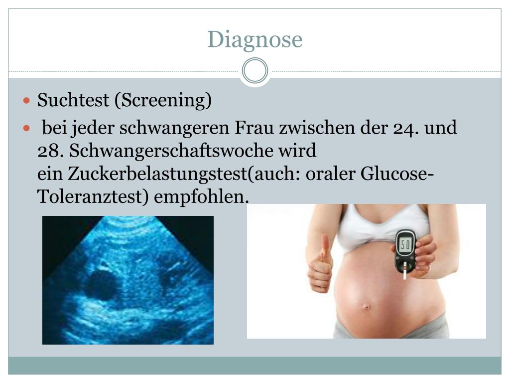Diagnose Suchtest (Screening) bei jeder schwangeren Frau zwischen der 24. und 28. Schwangerschaftswoche wird ein Zuckerbelastungstest(auch: oraler Glucose-Toleranztest) empfohlen.