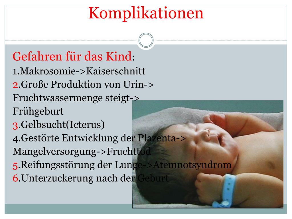 Komplikationen Gefahrenfür das Kind: 1.Makrosomie->Kaiserschnitt 2.Große Produktion von Urin-> Fruchtwassermengesteigt-> Frühgeburt 3.Gelbsucht(Icterus) 4.Gestörte EntwicklungderPlazenta-> Mangelversorgung->Fruchttod 5.Reifungsstörung der Lunge->Atemnotsyndrom 6.Unterzuckerung nachderGeburt
