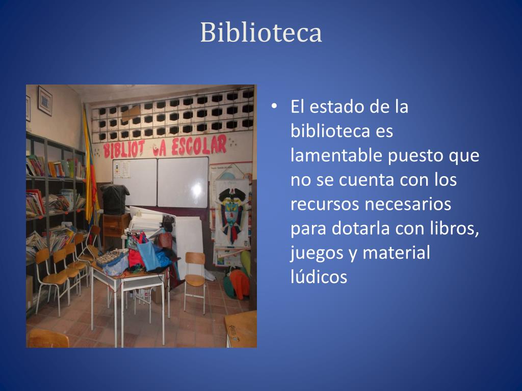 Biblioteca • El estado de la biblioteca es lamentable puesto que no se cuenta con los recursos necesarios para dotarla con libros, juegos y material lúdicos
