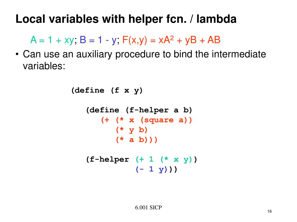 Local variables with helper fcn. / lambda A = 1 + xy; B = 1 - y; F(x,y) = xA2 + yB + AB • Can use an auxiliary procedure to bind the intermediate variables: • (define (f x y) • (define (f-helper a b) • (+ (* x (square a)) • (* y b) • (* a b))) • (f-helper (+ 1 (* x y)) • (- 1 y))) 6.001 SICP