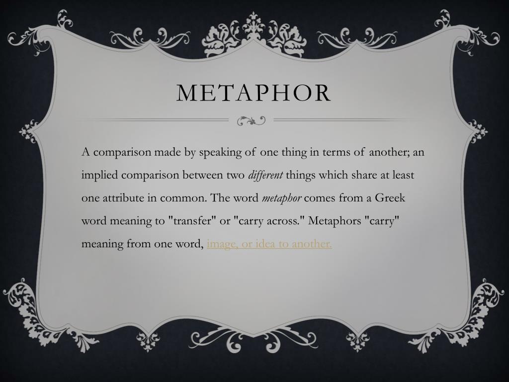 Metaphor Acomparison made by speaking of one thing in terms of another; an implied comparison between two different things which share at least one attribute in common. The word metaphorcomes from a Greek word meaning to "transfer" or "carry across." Metaphors "carry" meaning from one word, image, or idea to another.