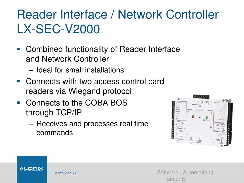 Reader Interface / Network Controller LX-SEC-V2000 • Combined functionality of Reader Interface and Network Controller • Ideal for small installations • Connects with two access control card readers via Wiegand protocol • Connects to the COBA BOS through TCP/IP • Receives and processes real time commands