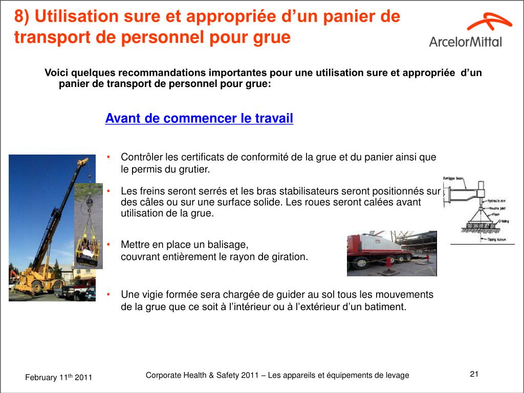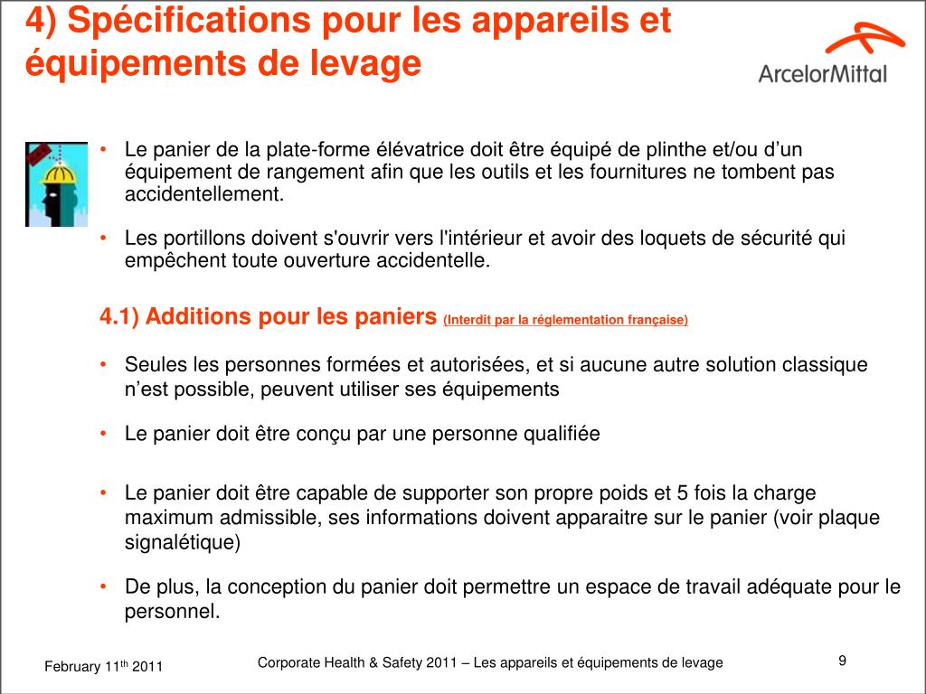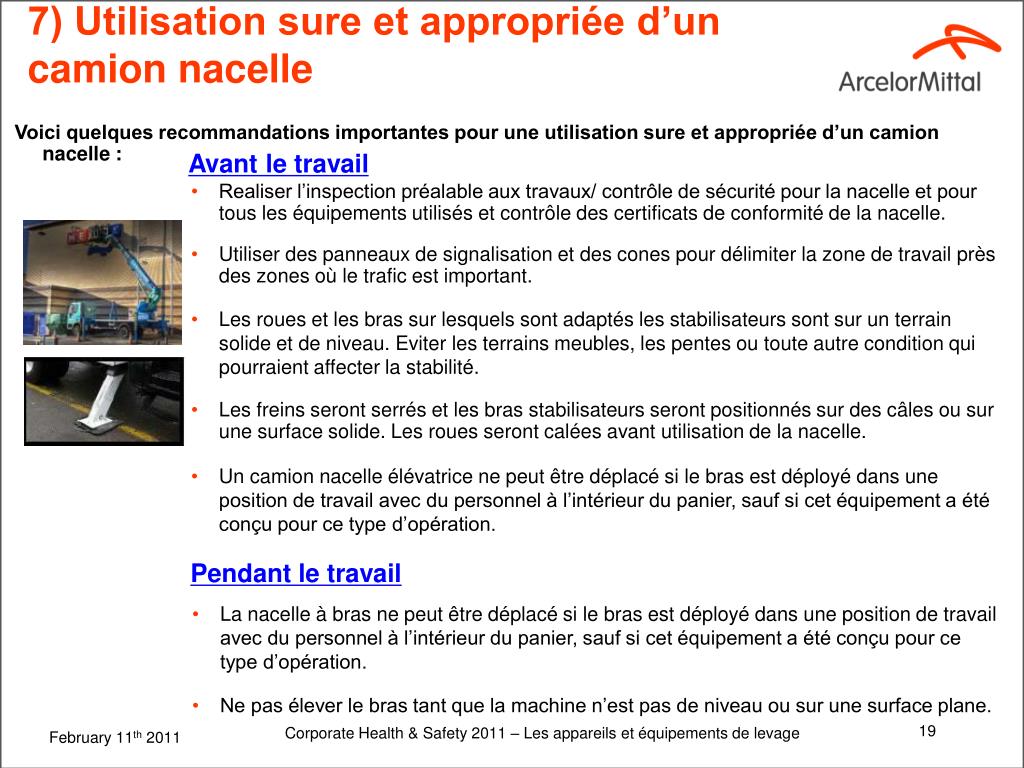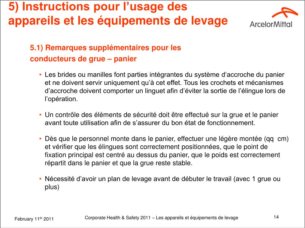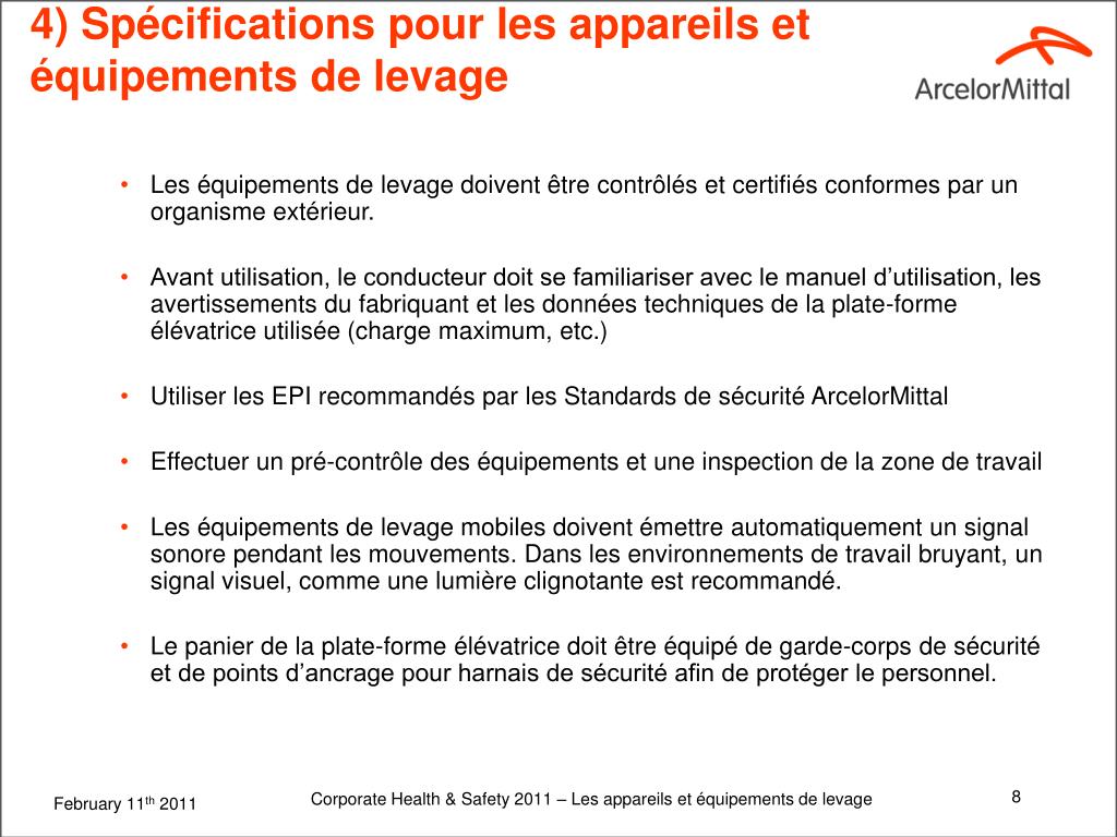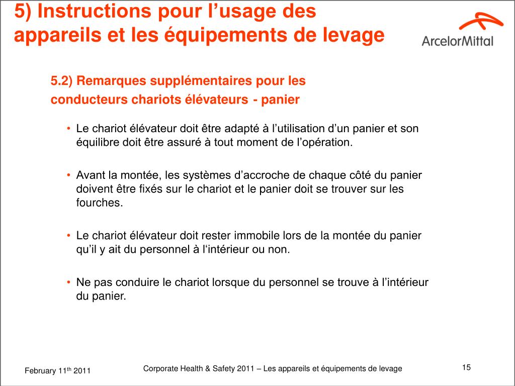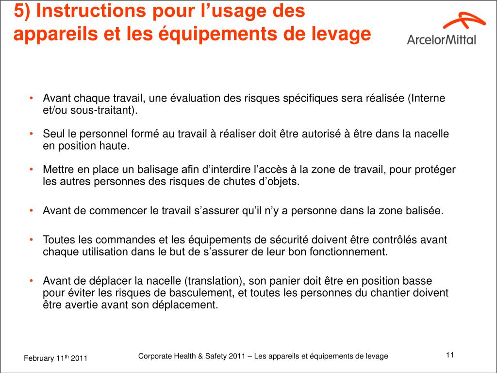 4) Spécifications pour les appareils et équipements de levage • Les équipements de levage doivent être contrôlés et certifiés conformes par un organisme extérieur. • Avant utilisation, le conducteur doit se familiariser avec le manuel d’utilisation, les avertissements du fabriquant et les données techniques de la plate-forme élévatrice utilisée (charge maximum, etc.) • Utiliser les EPI recommandés par les Standards de sécurité ArcelorMittal • Effectuer un pré-contrôle des équipements et une inspection de la zone de travail • Les équipements de levage mobiles doivent émettre automatiquement un signal sonore pendant les mouvements. Dans les environnements de travail bruyant, un signal visuel, comme une lumière clignotante est recommandé. • Le panier de la plate-forme élévatrice doit être équipé de garde-corps de sécurité et de points d’ancrage pour harnais de sécurité afin de protéger le personnel. Corporate Health & Safety 2011 – Les appareils et équipements de levage