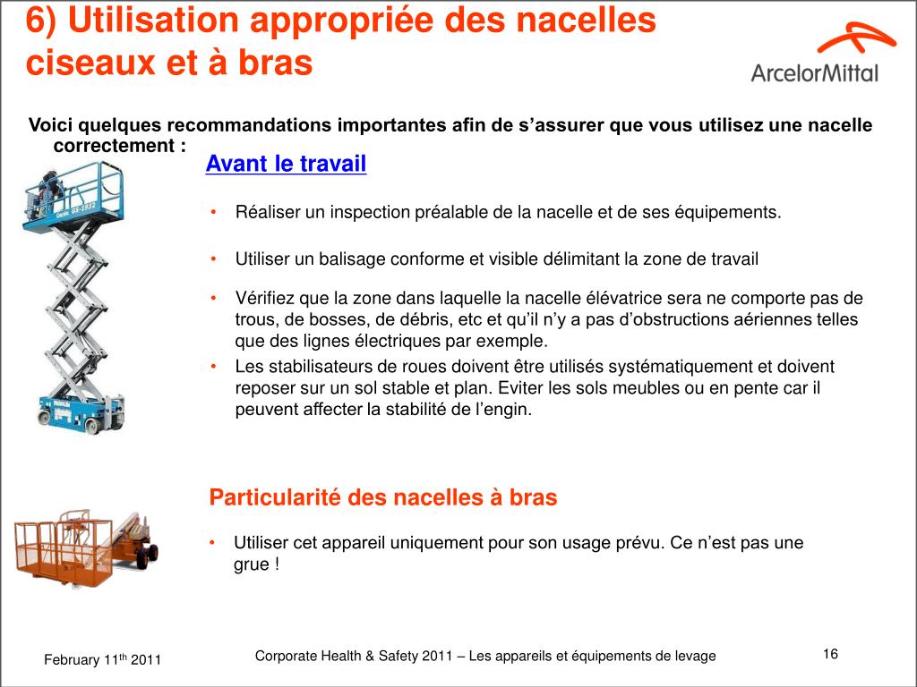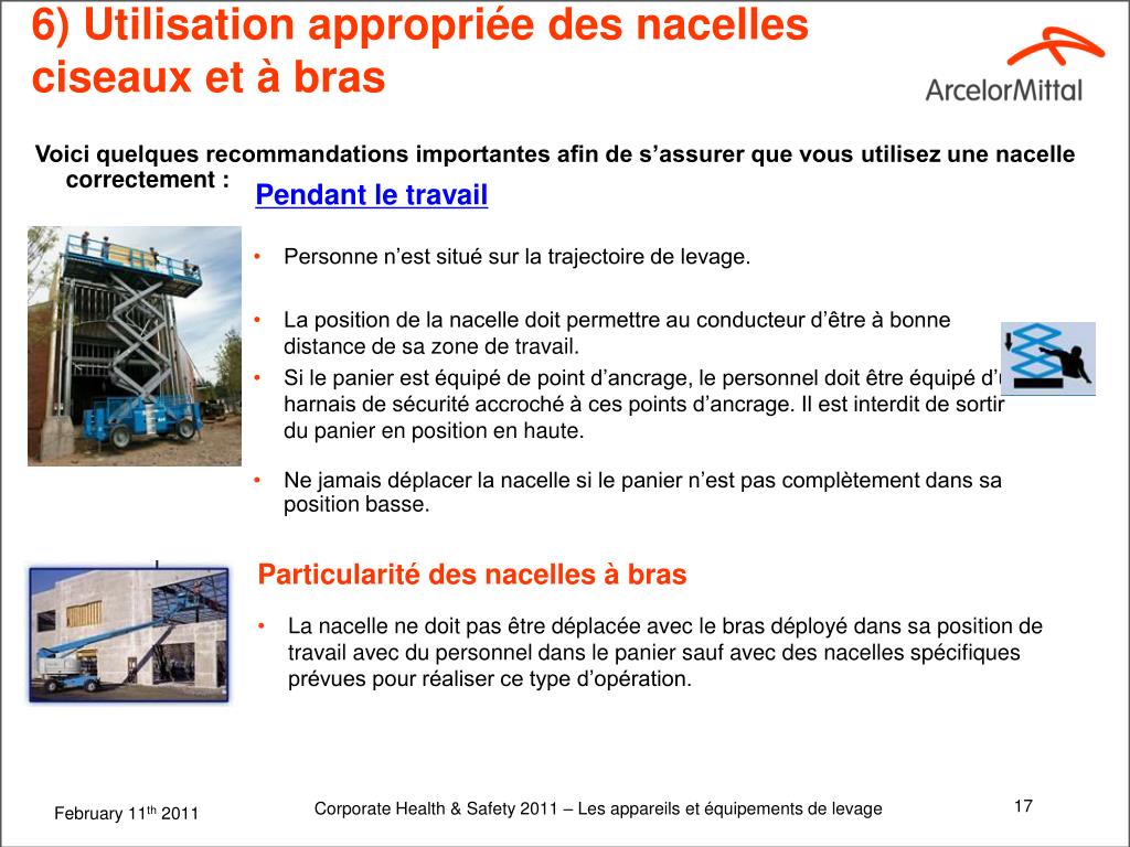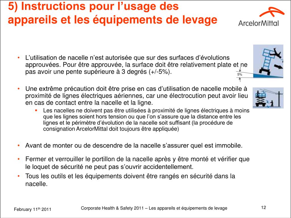 5) Instructions pour l’usage des appareils et les équipements de levage 5% • L’utilisation de nacelle n’est autorisée que sur des surfaces d’évolutions approuvées. Pour être approuvée, la surface doit être relativement plate et ne pas avoir une pente supérieure à 3 degrés (+/-5%). • Une extrême précaution doit être prise en cas d’utilisation de nacelle mobile à proximité de lignes électriques aériennes, car une électrocution peut avoir lieu en cas de contact entre la nacelle et la ligne. • Les nacelles ne doivent pas être utilisées à proximité de lignes électriques à moins que les lignes soient hors tension ou que l’on s’assure que la distance entre les lignes et le périmètre d’évolution de la nacelle soit suffisant (la procédure de consignation ArcelorMittal doit toujours être appliquée) • Avant de monter ou de descendre de la nacelle s’assurer quel est immobile. • Fermer et verrouiller le portillon de la nacelle après y être monté et vérifier que le loquet de sécurité ne peut pas s’ouvrir accidentellement. • Tous les outils et les équipements doivent être rangés en sécurité dans la nacelle. Corporate Health & Safety 2011 – Les appareils et équipements de levage