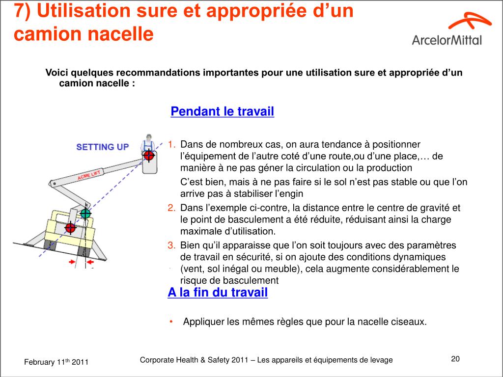 7) Utilisation sure et appropriée d’un camion nacelle Voici quelques recommandations importantes pour une utilisation sure et appropriée d’un camion nacelle : Avant le travail • Realiser l’inspection préalable aux travaux/ contrôle de sécurité pour la nacelle et pour tous les équipements utilisés et contrôle des certificats de conformité de la nacelle. • Utiliser des panneaux de signalisation et des cones pour délimiter la zone de travail près des zones où le trafic est important. • Les roues et les bras sur lesquels sont adaptés les stabilisateurs sont sur un terrain solide et de niveau. Eviter les terrains meubles, les pentes ou toute autre condition qui pourraient affecter la stabilité. • Les freins seront serrés et les bras stabilisateurs seront positionnés sur des câles ou sur une surface solide. Les roues seront calées avant utilisation de la nacelle. • Un camion nacelle élévatrice ne peut être déplacé si le bras est déployé dans une position de travail avec du personnel à l’intérieur du panier, sauf si cet équipement a été conçu pour ce type d’opération. Pendant le travail • La nacelle à bras ne peut être déplacé si le bras est déployé dans une position de travail avec du personnel à l’intérieur du panier, sauf si cet équipement a été conçu pour ce type d’opération. • Ne pas élever le bras tant que la machine n’est pas de niveau ou sur une surface plane. Corporate Health & Safety 2011 – Les appareils et équipements de levage